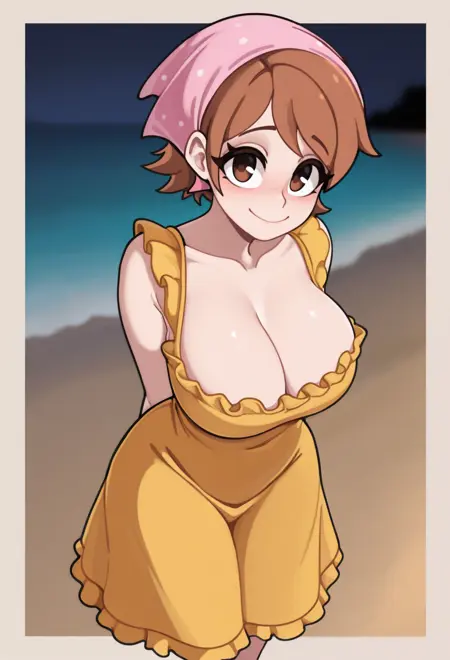 캐릭터 태그: 갈색 머리카락, 짧은 머리, 갈색 눈, 밴다나, 머리 수건