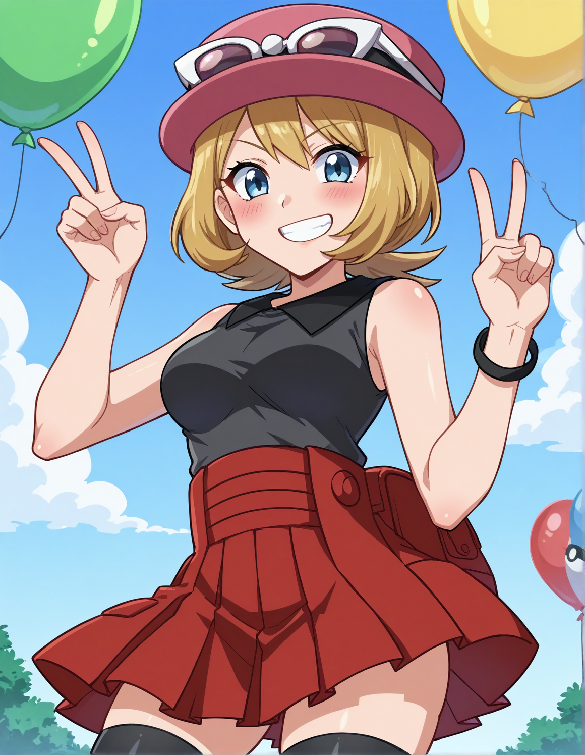 トリガーワード:yvonne gabena, 1girl, solo, (pink hat), eyewear on headwear, short hair, bangs, blonde hair, blue eyes, sleeveless shirt, pleated skirt, (thighhighs)