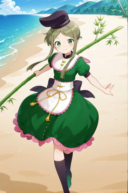 black hat, tate eboshi, green dress, puffy short sleeves, yellow bowtie, buttons, white apron, yellow ribbon, back bow, black bow, black socks, green shoes,