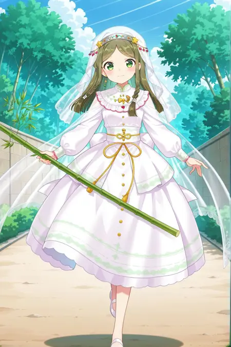 teireida mai, 1girl, solo, green eyes, green hair, long hair, twin braids,, teireida mai \(white bamboo teireita-douji\), alternate costume, bridal veil, hair ornament, hat ornament, silver hairband, earrings, see-through cape, white dress, wedding dress, long sleeves, green trims, white sash, gold trims, white skirt, white shoes, holding bamboo,