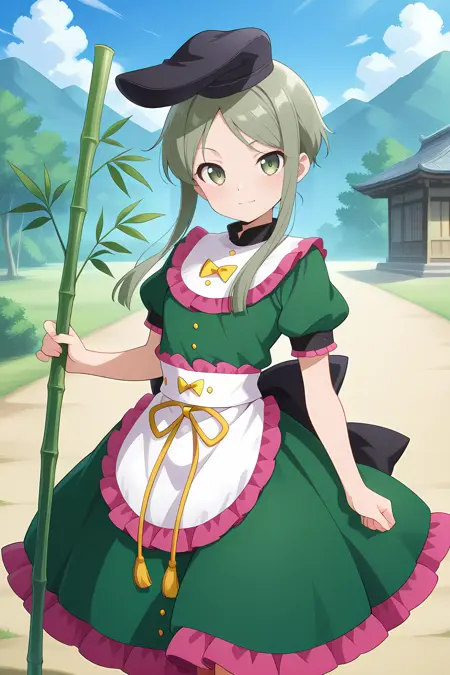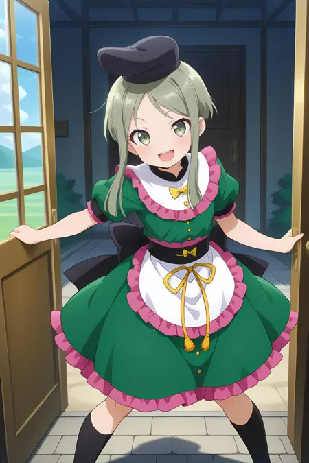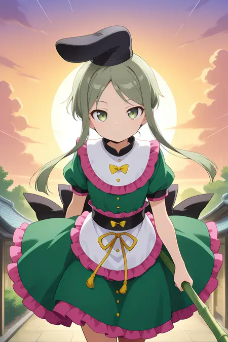 black hat, tate eboshi, green dress, puffy short sleeves, yellow bowtie, buttons, white apron, yellow ribbon, back bow, black bow, black socks, green shoes,