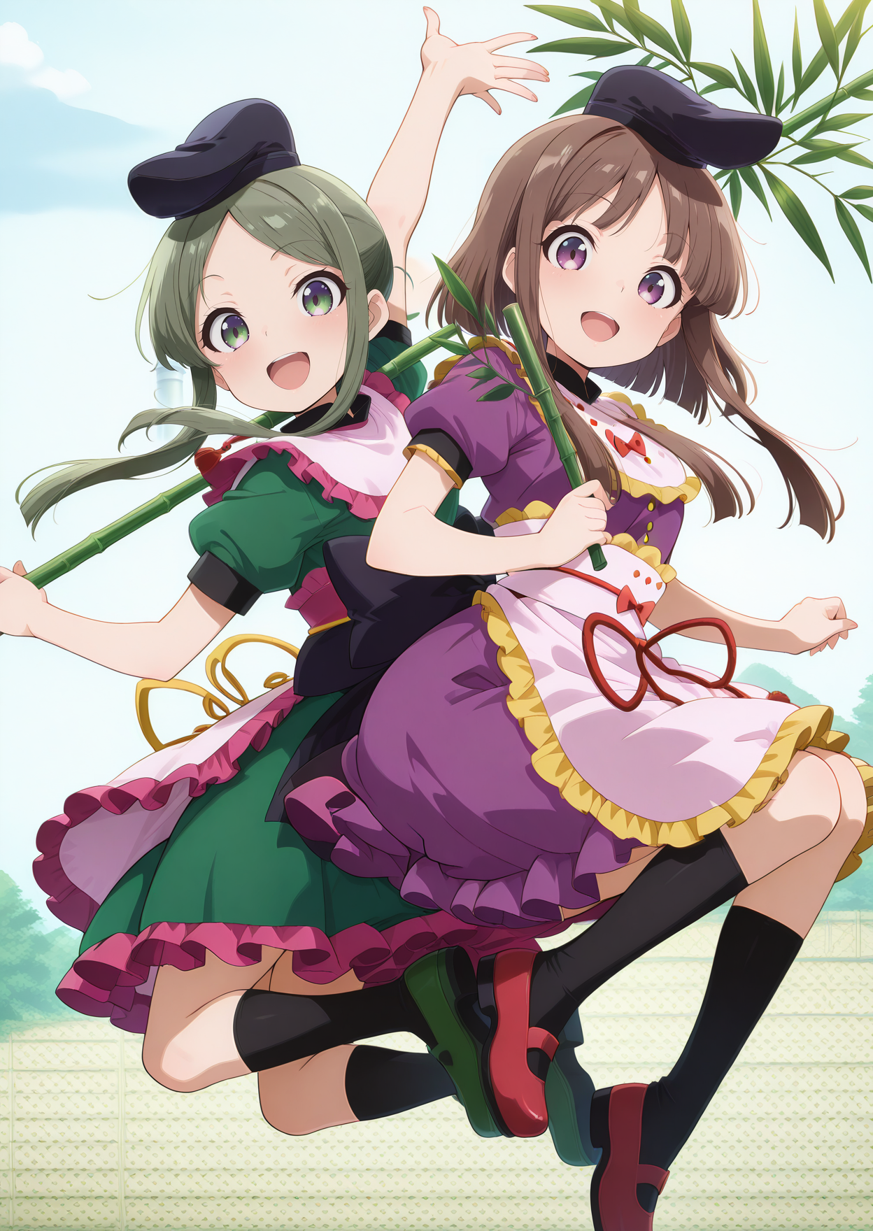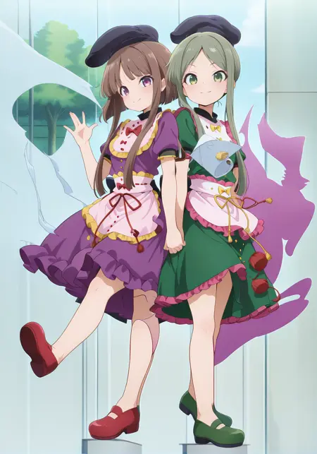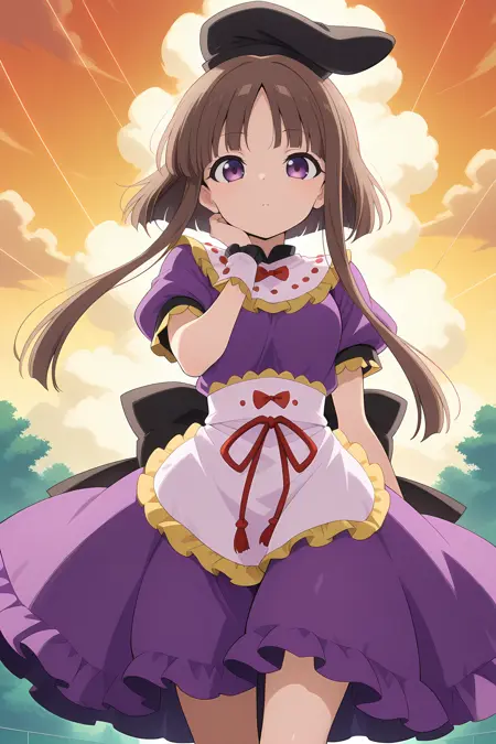black hat, tate eboshi, red bowtie, red ribbon, white capelet, purple dress, puffy short sleeves, waist apron, white apron, back bow, black bow, kneehighs, mary janes, purple shoes,