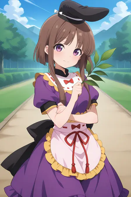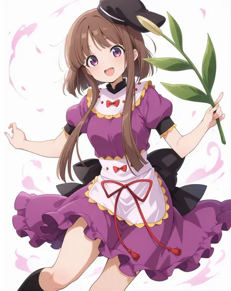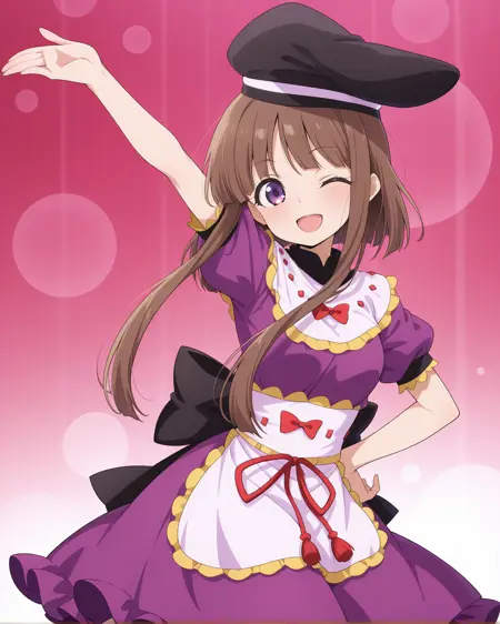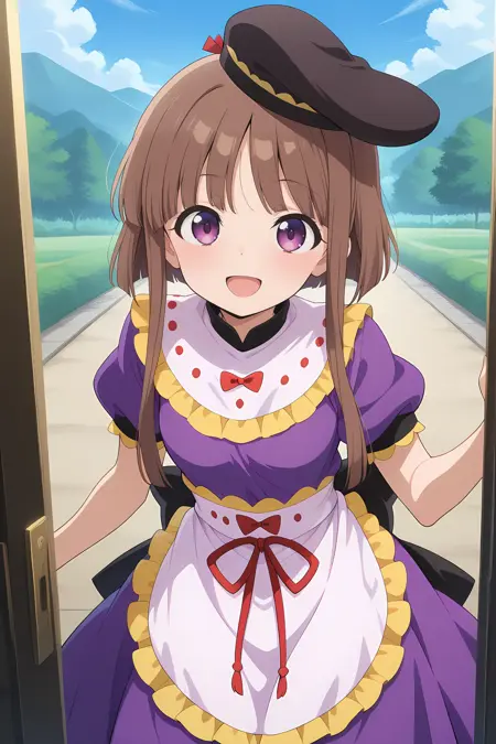 hat, short sleeves, bow, purple dress, ribbon, frills, waist apron, ribbon,