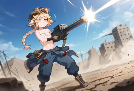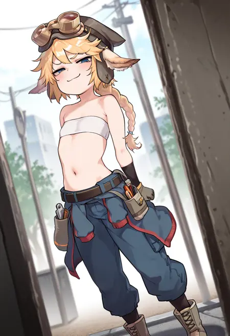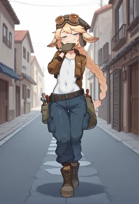 衣装: バンドー、手袋、カーゴパンツ、へそ、ウエストに巻きつけたジャケット、ブーツ、頭部に取り付けられたゴーグル、ベルト、ツール、ベルトポーチ、