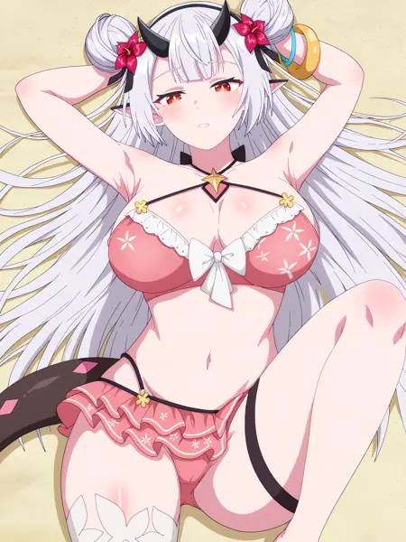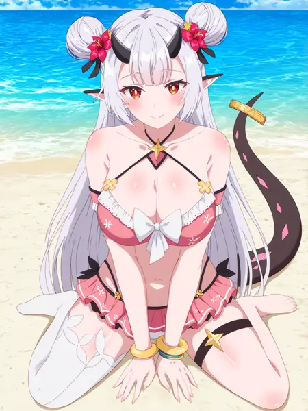 holiday yufine \(epic seven\), white hair, long hair, double bun, red eyes, dragon girl, dragon horns, pointy ears, hair ornament, hair flower, pink bikini, frilled bikini, bikini skirt, halterneck, criss-cross halter, bracelet, bow, cleavage, single thighhigh, thigh strap, large breasts, dragon tail, tail ornament