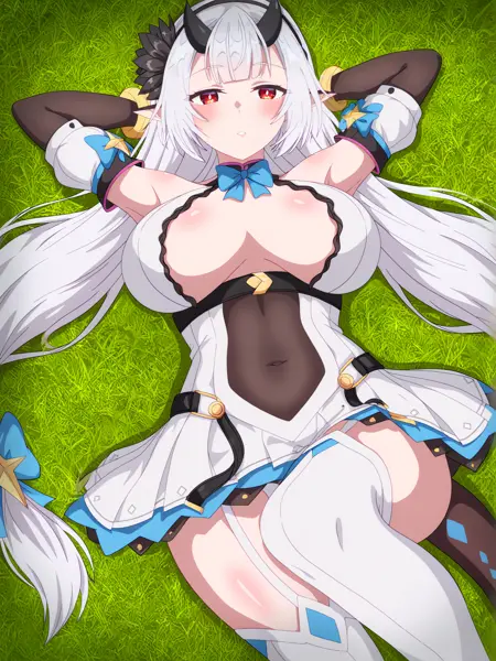 yufine \(epic seven\), white hair, long hair, low twintails, low-tied long hair, red eyes, dragon girl, dragon horns, pointy ears, hair ornament, white dress, bodystocking, detached sleeves, thigh boots, garter straps, bow, bracelet, covered navel, cleavage cutout, large breasts, dragon tail, tail ornament