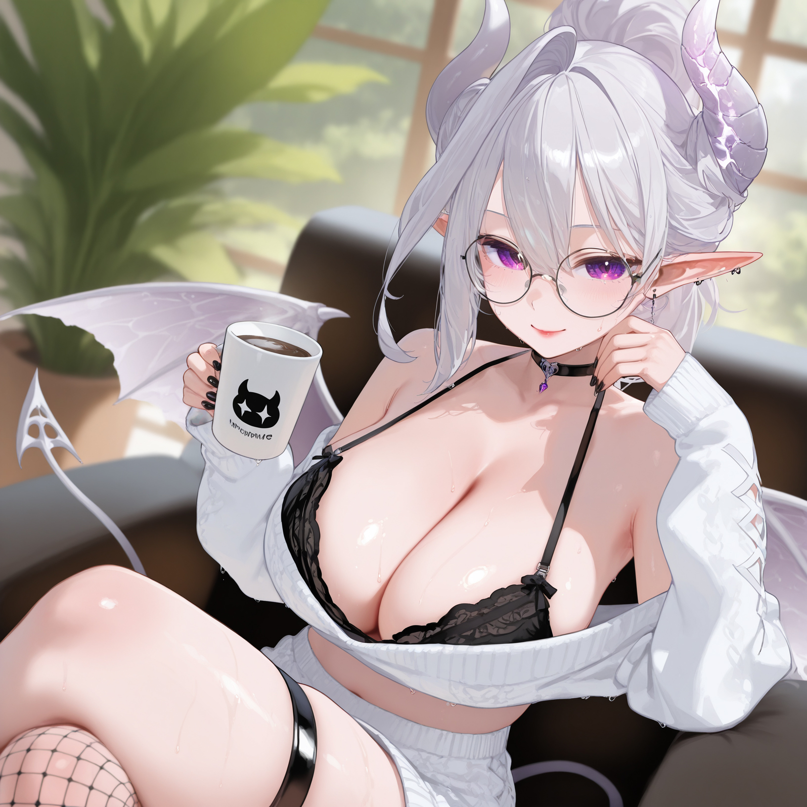 mirunemochi, 紫色の目, 角, 尖った耳, 低い白い翼, 悪魔の尾, チョーカー, 耳飾り, 大腿ストラップ, フィッシュネッツ, 非対称な脚の装い, 白いセーター, 黒いブラ, 外れた袖, 円形の眼鏡