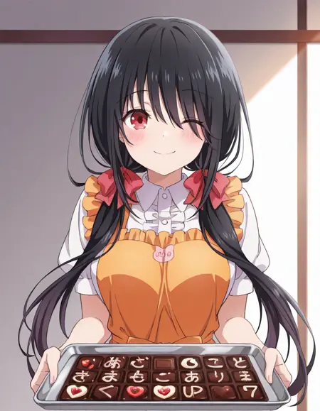 Kurumi, medium breast, red eyes, long hair, black hair, half updo