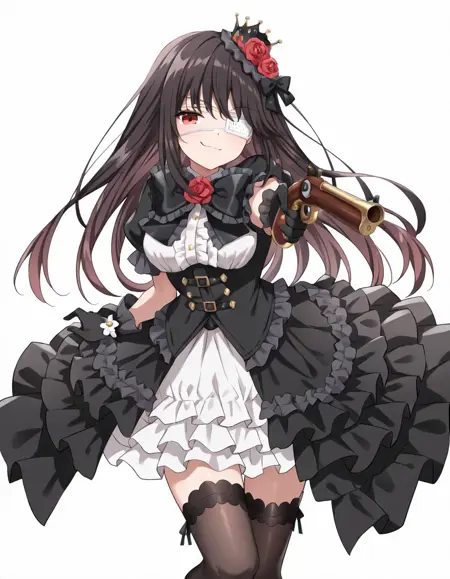 teen_layered_dress, black dress, white dress, teen_hair_ornament, teen_dress_bow, teen_dress_flower, teen_gloves, teen_eyepatch, teen_hair_flower, teen_thighhighs, teen_shoes