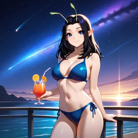옵션: 검은 머리, 긴 머리, 촉수, 뾰족한 귀, 검은 눈, 녹색 드레스, 잎 드레스, 검은 레깅스, 녹색 바디수트, 손가락 없는 장갑,