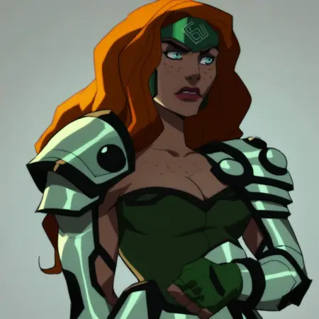 lipstick, orange hair, long hair, freckles, blue eyes, cleavage, fingerless gloves, headpiece, armor, leotard, Knockout (dc)