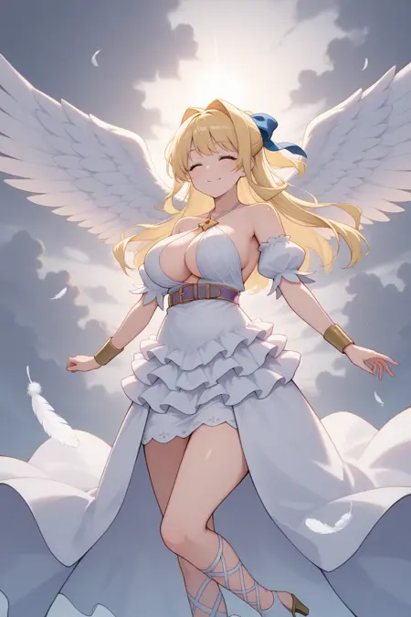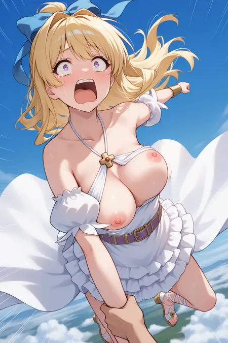 Outfit : white dress, frilled dress, halterneck, center opening, purple belt, detached sleeves, white sleeves, puffy short sleeves, bracer, cross-laced sandals, high heel sandals
