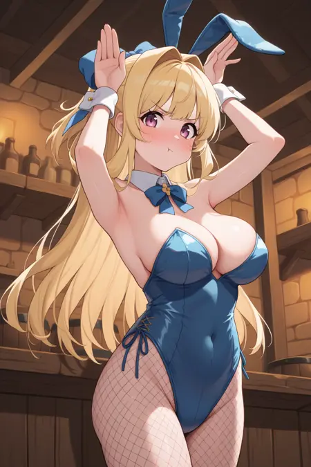 Appearance : r1st4rt3, large breasts, purple eyes, blonde hair, hair intakes, sidelocks tied back, long hair, half updo, blue hair bow