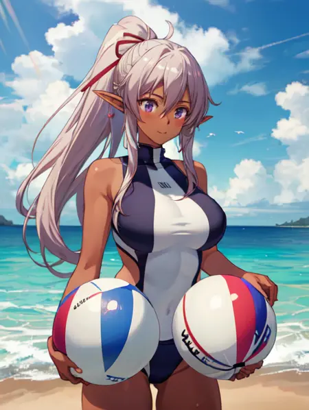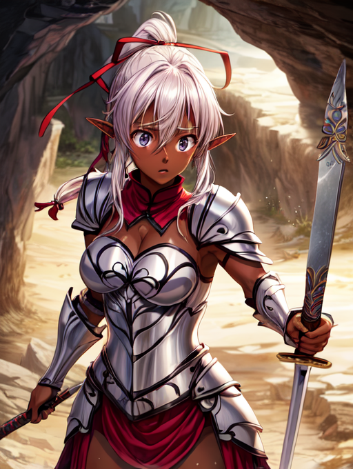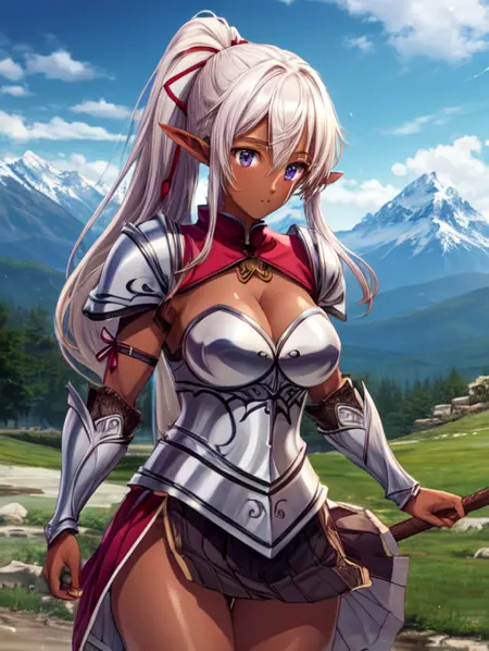 Additional words that may help: armor, breastplate, skirt, dark skin, elf, ponytail, ribbon,