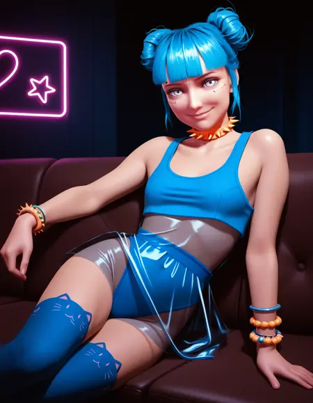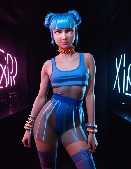 xbluemoonx, blue hair, double bun, blunt bangs, short hair, grey eyes, extra pupils, cyberpunk
