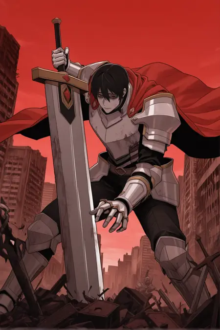 For better appearance add "armor, red cape, red eyes, black hair, pauldrons, bags under eyes, shoulder armor, "