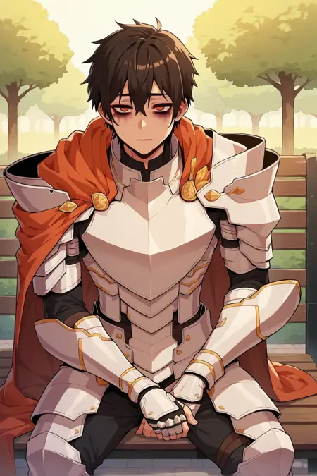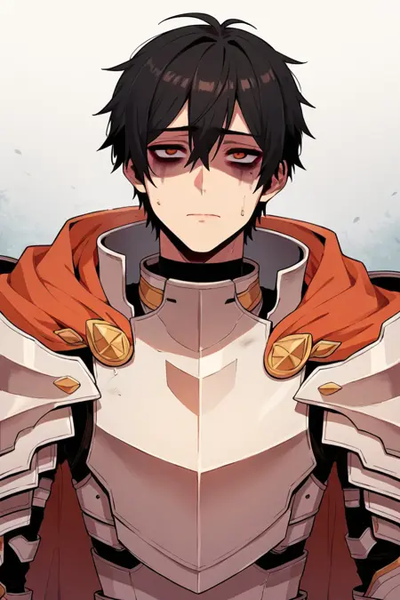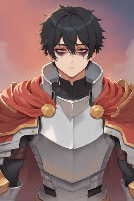 より良い外見には以下を追加:"armor, red cape, red eyes, black hair, pauldrons, bags under eyes, shoulder armor,"