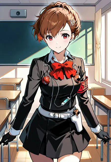 p3kotone-sees, 月光学園の制服, アームバンド, スカート, ジャケット, 黒いジャケット, 長袖, ソックス, グローブ, 黒いグローブ, ニーソックス, 黒いスカート, 赤いリボン, 白い靴下, 茶色の靴, ホルスター, 白いホルスター, ベルト, 白いベルト
