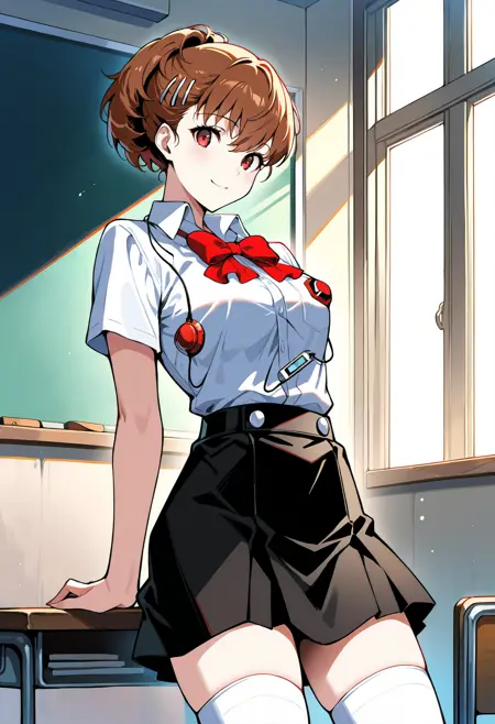 p3kotone-sumuni, 月光学園の制服, スカート, 黒いスカート, シャツ, 白いシャツ, 短袖, ニーソックス, 黒いスカート, 赤いリボン, 白い靴下, 茶色の靴
