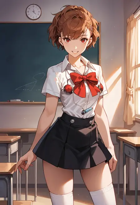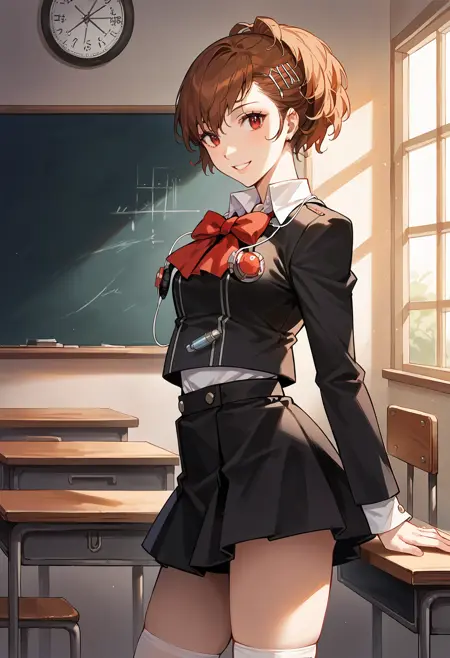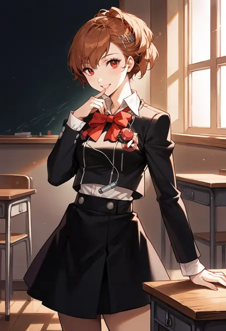 p3kotone-sees, 月光馆高中校服, 臂章, 裙子, 外套, 黑色外套, 长袖, 袜子, 手套, 黑色手套, 长筒袜, 黑色裙子, 红色蝴蝶结, 白色袜子, 棕色鞋子, 手枪套, 白色手枪套, 腰带, 白色腰带,