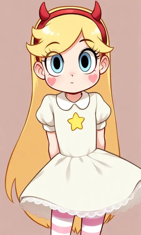 star butterfly,1girl, long hair,blonde hair, red hairband, little demon horns, blue eyes, heart cheek marks, collared dress, teal dress, short sleeves, lace trim, striped pantyhose, pink pantyhose, orange pantyhose