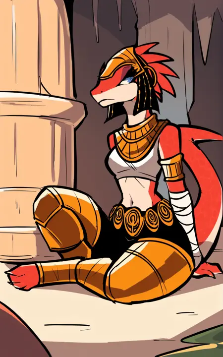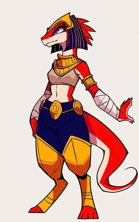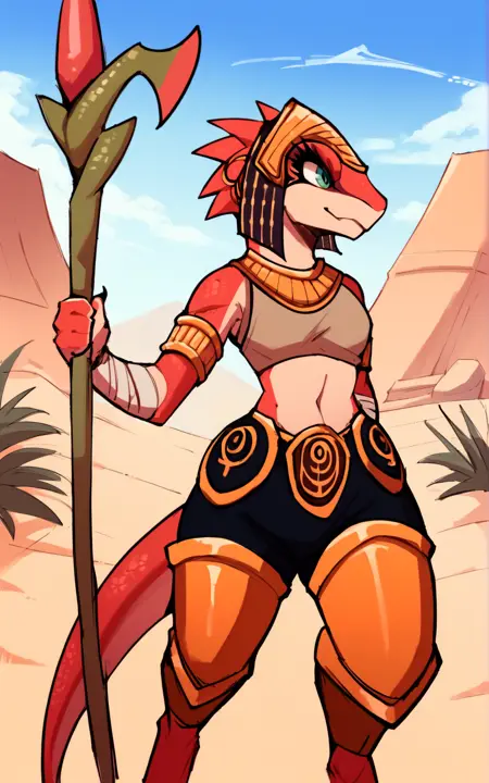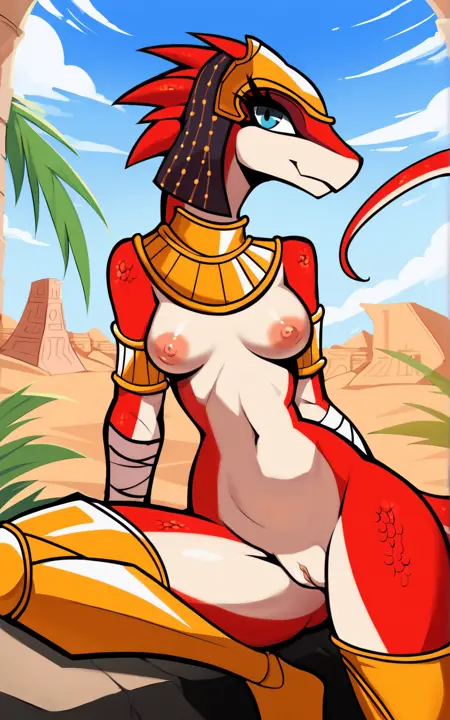 강화 태그: 빨간 피부, 빨간 머리, 이집트식, 두건, 비늘 피부, 털이 있는, 털이 있는 여성, 꼬리, 도마뱀 꼬리, 이집트식 복장