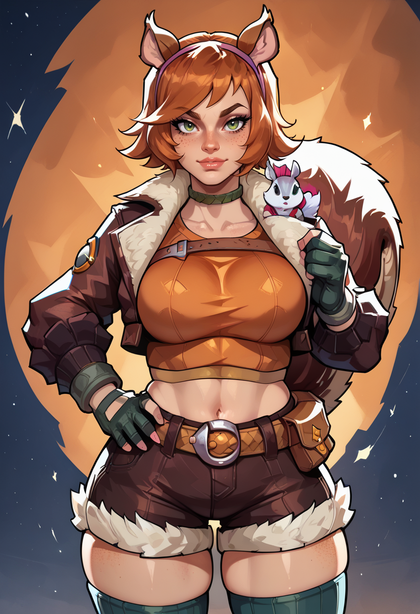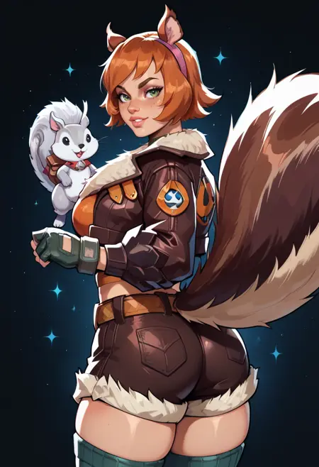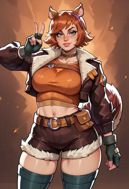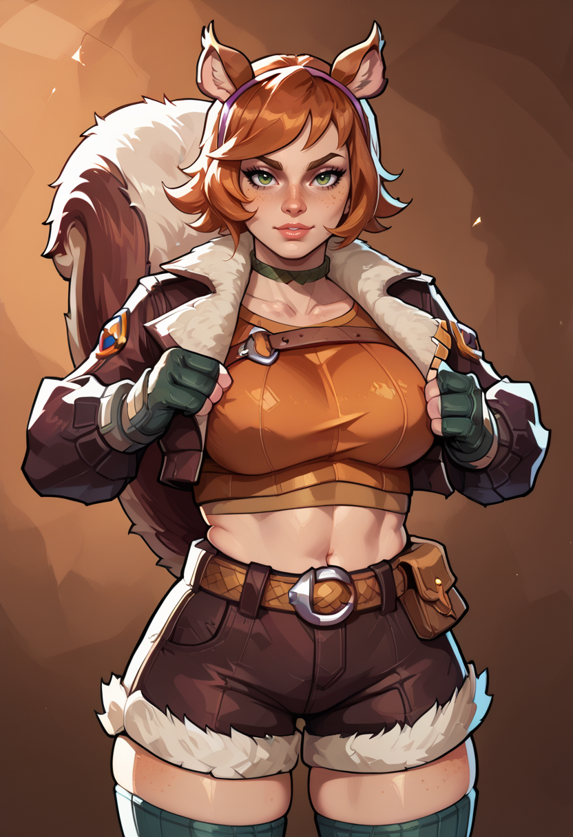 squirrel girl, squirrel ears, squirrel tail, short hair, red hair, freckles, green eyes, brown cropped jacket, fur trim, finger-less gloves, midriff, brown shorts, thigh-highs,