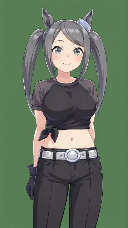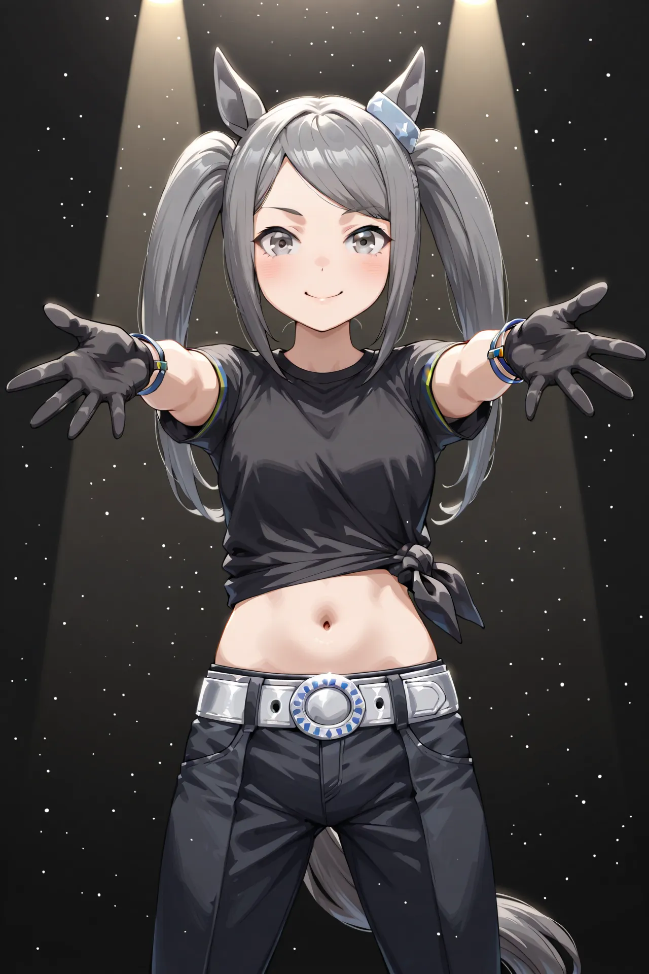 은색 벨트, 검은 장갑, 매듭 지은 셔츠, 검은 셔츠, 장갑, 허리, 셔츠, 배꼽, 바지,