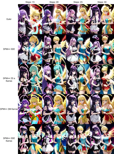 サンプラーとステップ数:DPM++ 2M Karrasは20ステップで良好な結果を出し始めますが、25ステップ以上を推奨します。DPM++ SDE Karrasは25ステップ以上で良好になります。EulerとDPM++ 2S a Karrasは15ステップで正しいが不気味な結果、30ステップ以上でより普通の結果になります。DPM++ SDEは最低30ステップ必要で、結果はまだ不気味になりがちです。