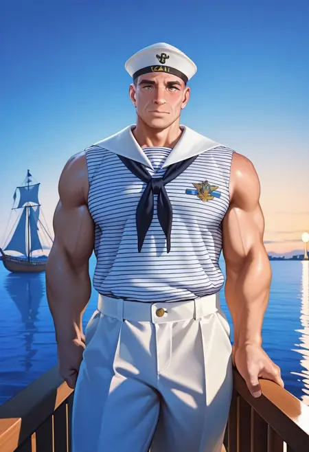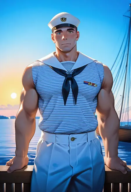 striped shirts, sleeveless, white sailor's cap, neckerchief, white flared pants,
