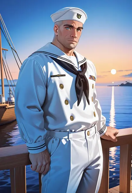 white shirts,white sailor's cap, neckerchief, white flared pants with gold buttons,