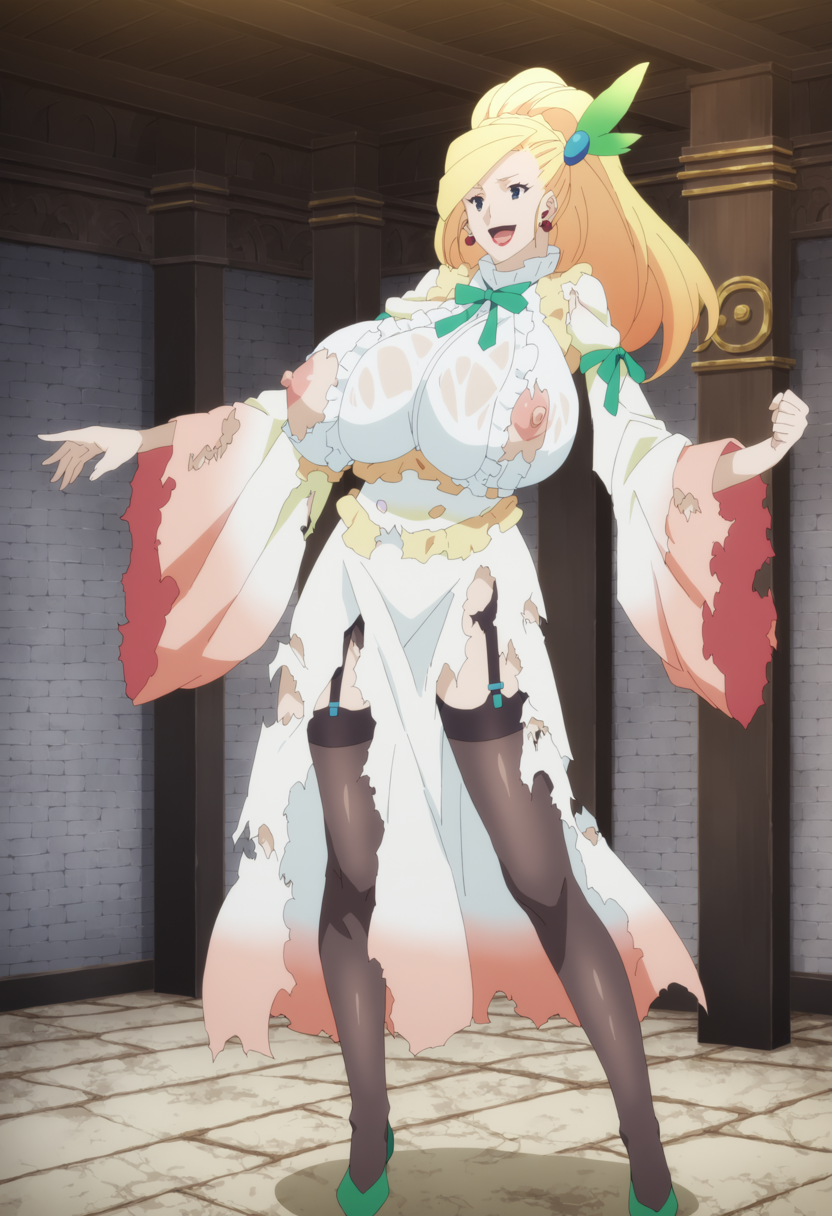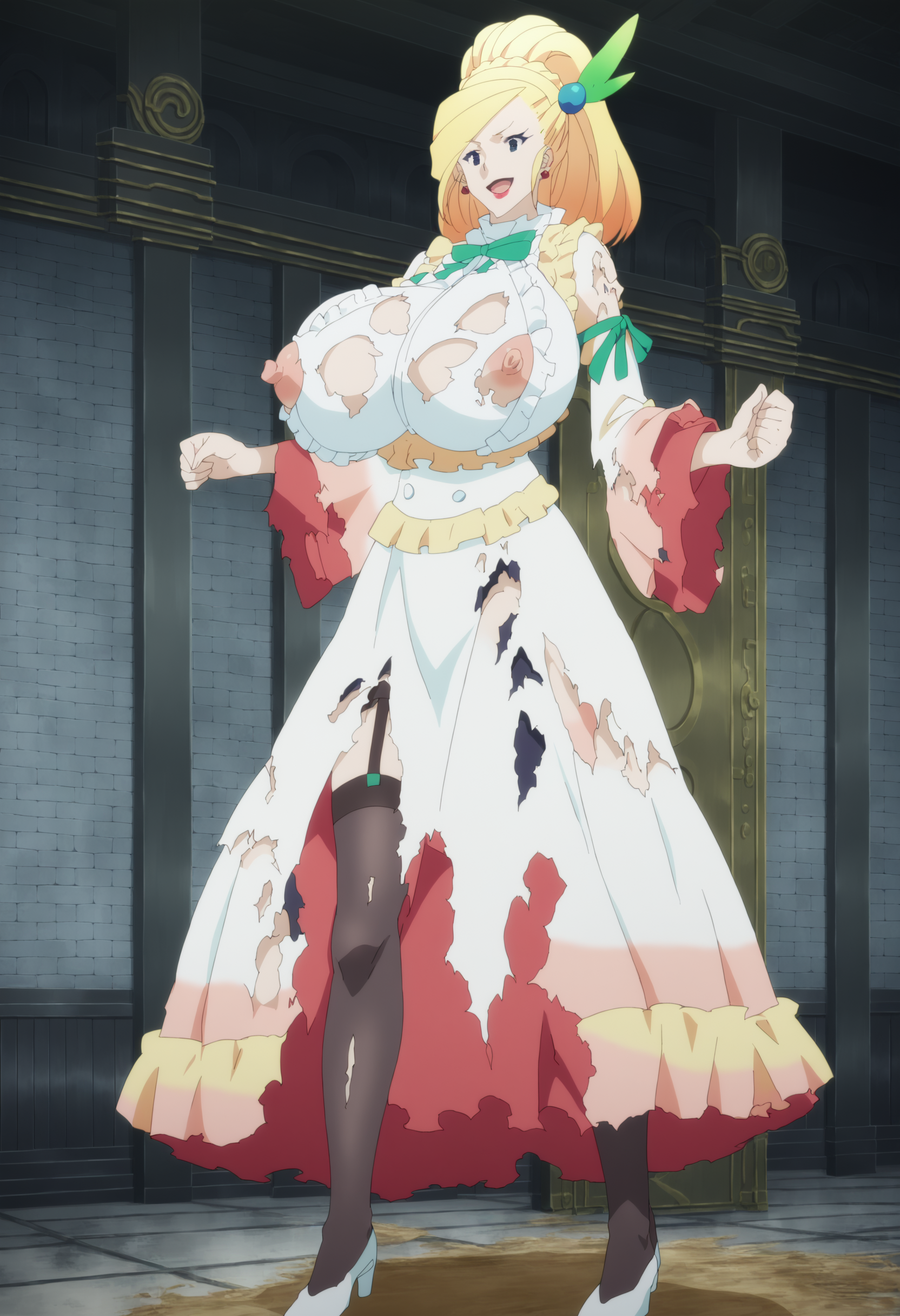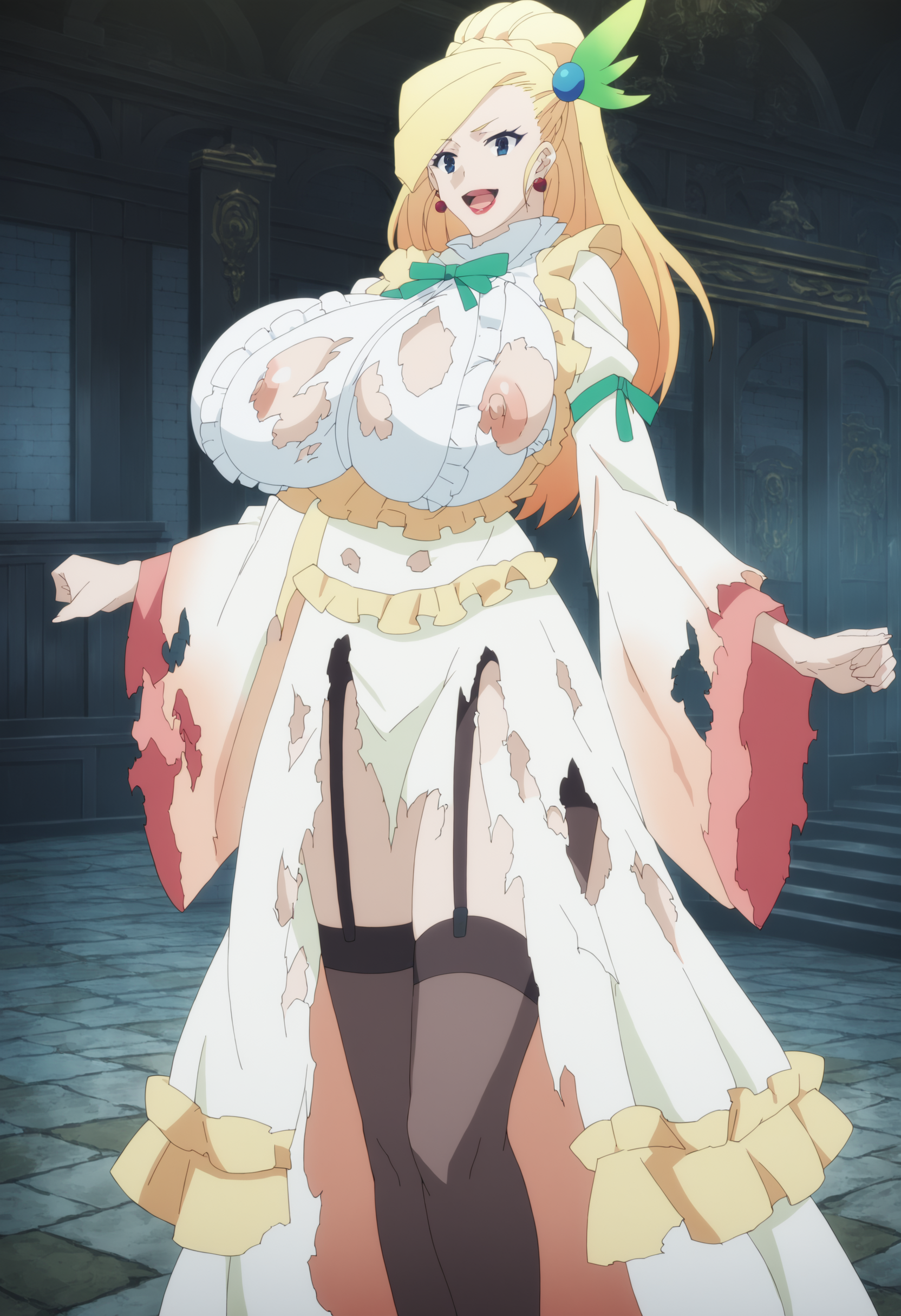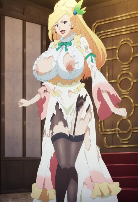 | トレーニングワード | Darkness_S2EP4_outfit2コピーしました! blue eyes, long hair, breasts, large breasts, blonde hair, hair ornamentコピーしました! white dress, long dress, gown, long sleeves, ribbon, jewelry,earrings, frills,frills on dress, lips, makeup, lipstick, green ribbon,wide sleevesコピーしました! |