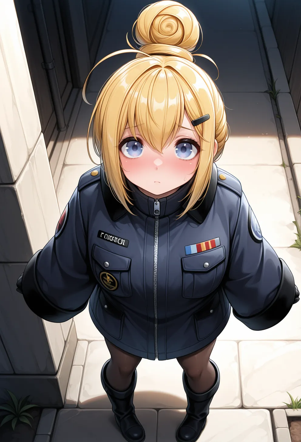 habe_stan,baggy clothes,loose clothes,oversized clothes,dark blue coat,blonde hair,blue eyes,hairclip,single hair bun,knee boots,black gloves,sleeves past wrists,brown pantyhose,military uniform,zipper,breasts,