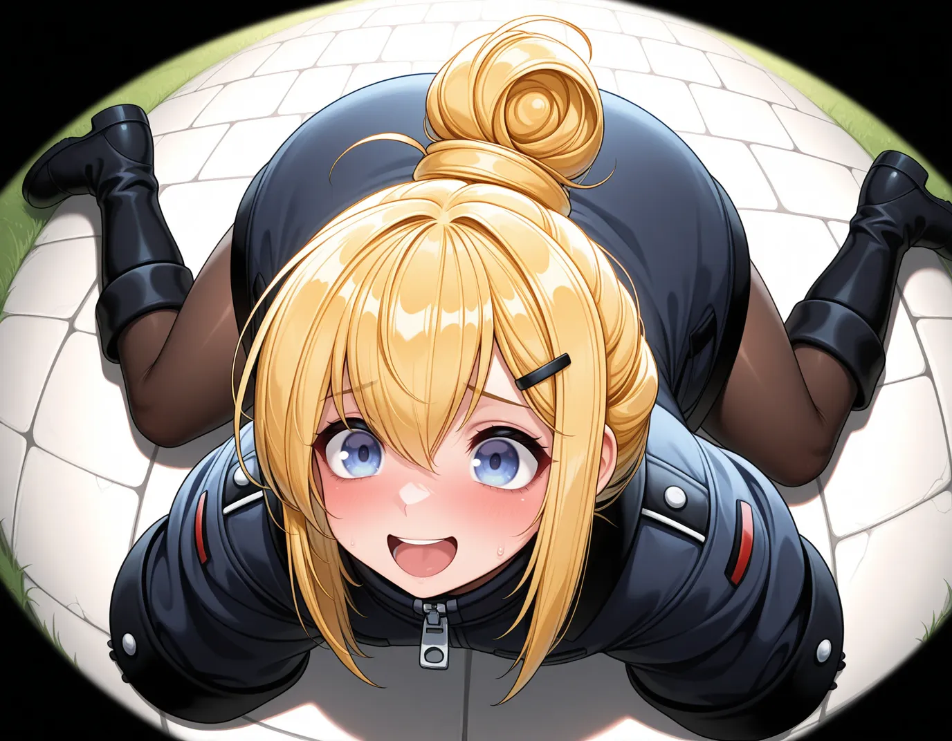 blonde hair,huge breasts,blue eyes,hairclip,single hair bun,low height,short height,