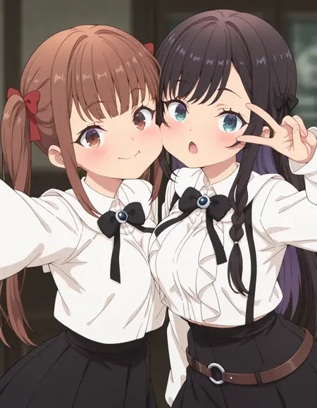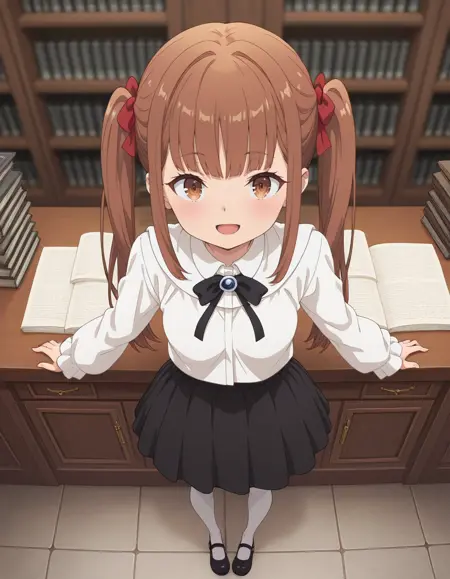 <lora:lyra-girumasu_s1-xl-anime-soralz:1>, lyra (girumasu), 長い髪, 茶色の髪, ツインテール, 髪リボン, まっすぐな前髪, 横髪, 茶色の目