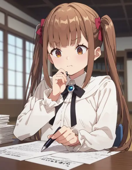 <lora:lyra-girumasu_s1-xl-anime-soralz:1>, lyra (girumasu), long hair, brown hair, twintails, hair ribbon, blunt bangs, sidelocks, brown eyes
