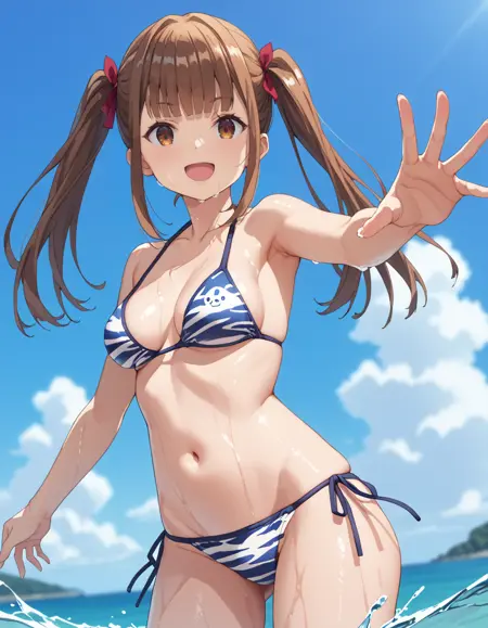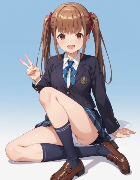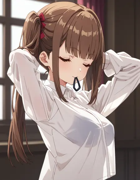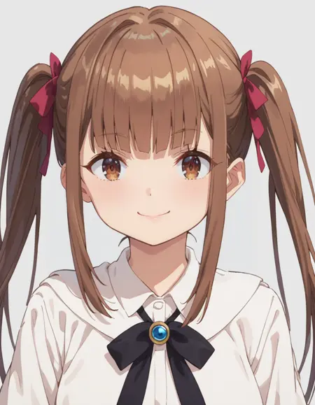 <lora:lyra-girumasu_s1-xl-anime-soralz:1>, lyra (girumasu), 긴 머리, 갈색 머리, 트윈테일, 헤어 리본, 둔한 앞머리, 옆머리, 갈색 눈