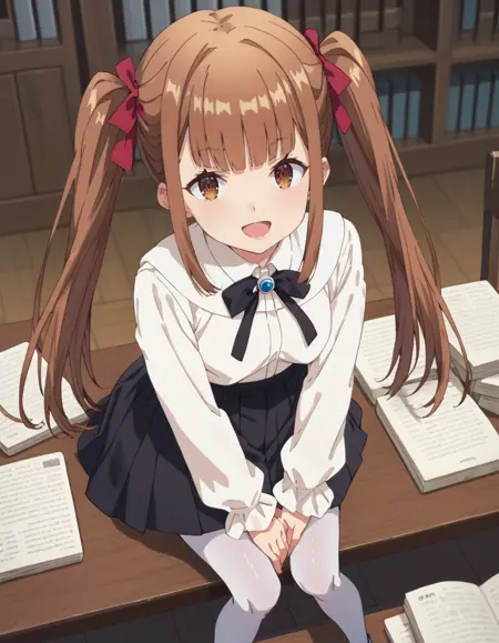 <lora:lyra-girumasu_s1-ixl-anime-soralz:1>, lyra (girumasu), 긴 머리, 갈색 머리, 트윈테일, 헤어 리본, 둔한 앞머리, 옆머리, 갈색 눈