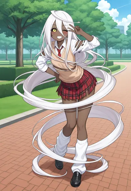 主要标签:mmDoppel、白发、呆毛、异常长发、深色皮肤、深色皮肤女性、棕色皮肤、黄眼睛、黑色巩膜、怪物女孩