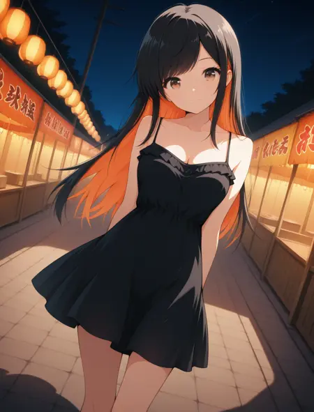 ShinobuFestival, uzuki shinobu, 1girl, long hair, brown eyes, black hair, long sidelocks, swept bangs, straight hair, colored inner hair, two-tone hair, orange hair, medium breasts, short dress, black sundress, spaghetti strap, frills, sleeveless, sandals, collarbone, cleavage, bare shoulders, bare arms, thighs, bare legs