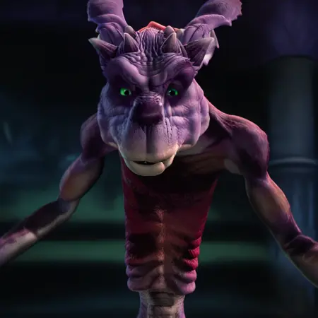 Scooby-Doo_Demon,furry,bunny,monster,rabbit ears,skinny,violet skin,wine red chest,green eyes,black pupils,realistic