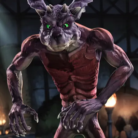 Scooby-Doo_Demon,furry,bunny,monster,rabbit ears,skinny,violet skin,wine red chest,green eyes,black pupils,realistic
