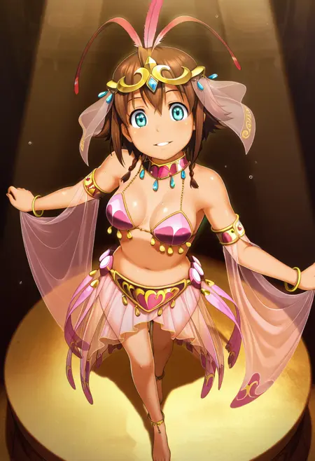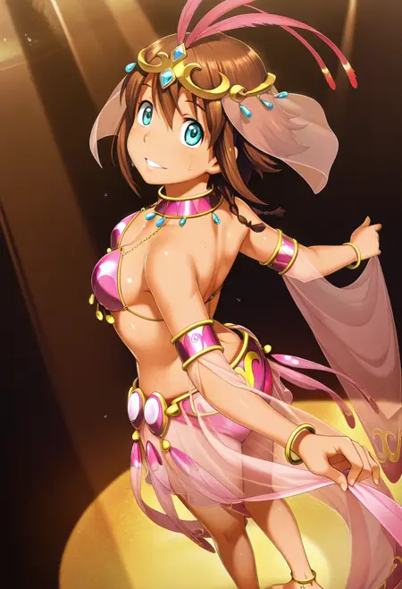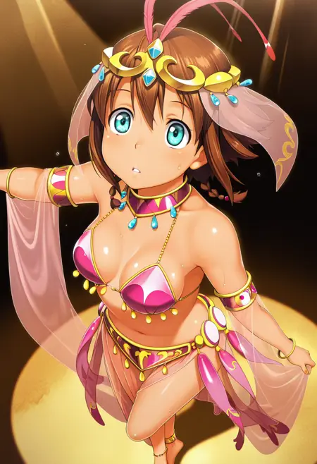 amydancer, hair ornament, feather hair ornament, tiara, veil, pink choker, bracelet, jewelry, armlet, see-through sleeves, detached sleeves, gold trim, dancer, harem outfit, arabian clothes, belly dancer, pink bikini, bikini armor, see-through, midriff, anklet,