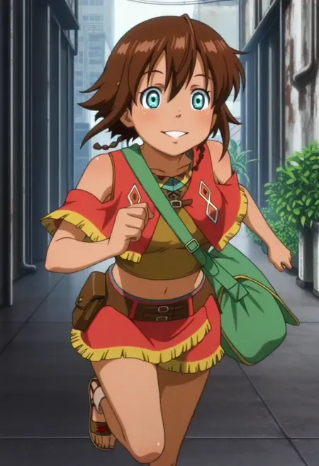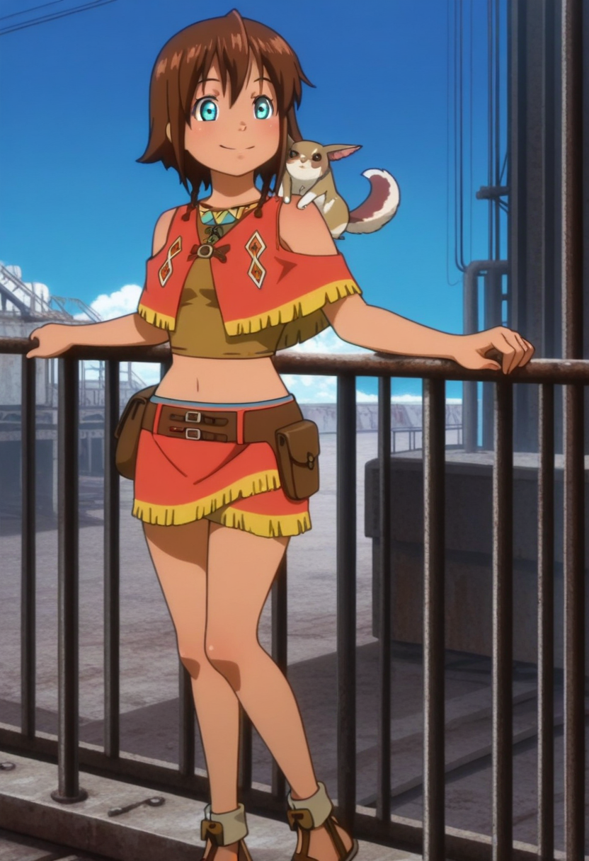 amycasu, orange capelet, shoulder cutout, crop top, midriff, brown belt, brown satchel, orange miniskirt, brown sandals,