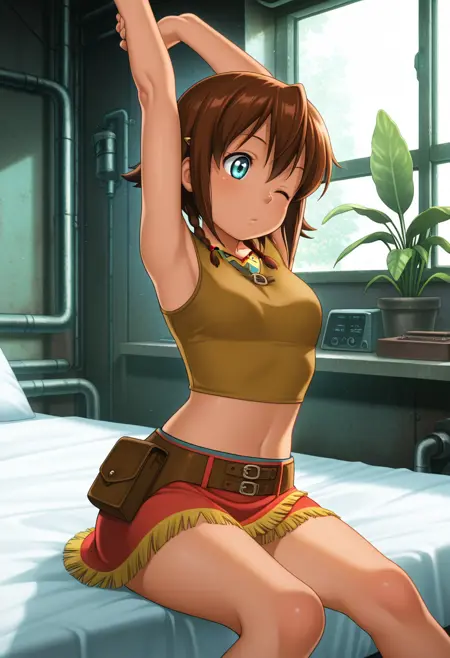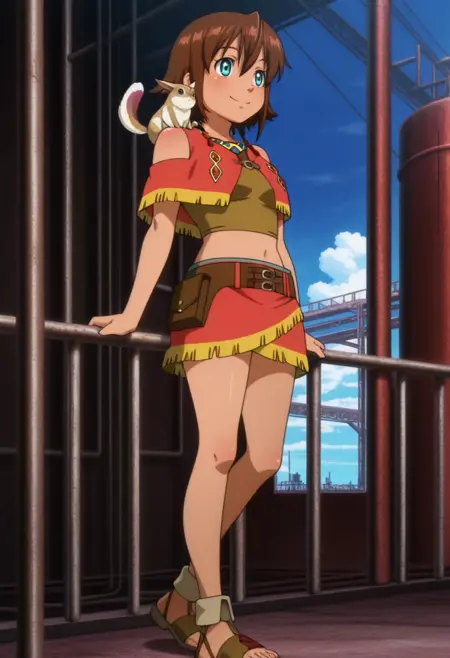 amycasu, orange capelet, shoulder cutout, crop top, midriff, brown belt, brown satchel, orange miniskirt, brown sandals,