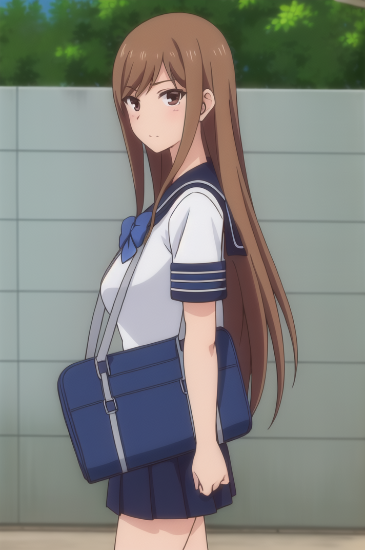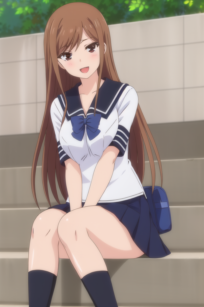 outfit_3, 학교 유니폼, 세라후쿠, 선원 목, 흰색 셔츠, 파란 리본, 짧은 소매, 파란 치마, 주름 치마, 검은 양말, 갈색 신발,