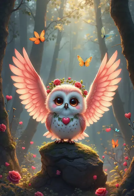 "bo-romance, 一幅高度精细的数字艺术作品,描绘两只威严的雄鹰组成心形。两只鹰并排站立,面向彼此,双翼完全展开,羽毛主要为白色并略带粉红,与深色羽毛形成鲜明对比。翅膀细节精致,纹理平滑,表面有光泽。它们拥有锐利的喙和锐利的眼神,强化了威严的气质。心形中央,一朵硕大鲜艳的粉红色玫瑰静静绽放,花瓣紧闭,为画面增添温暖与美感。背景是柔和的浅粉色,强化了空灵浪漫的氛围。整体构图对称均衡,双鹰构成中心心形,周围环绕着流动的精细线条与柔美花卉元素,点缀着细小的粉花与圆润金属装饰,增添优雅与浪漫气息"