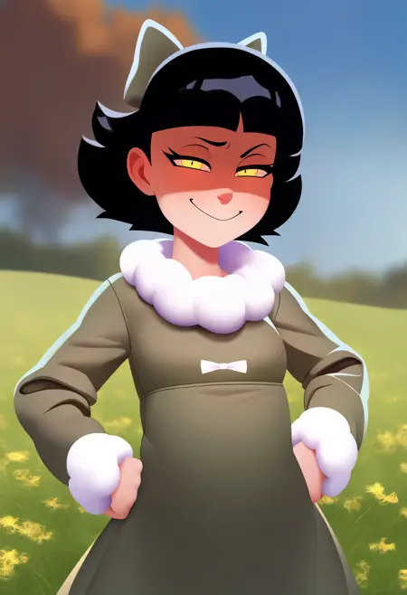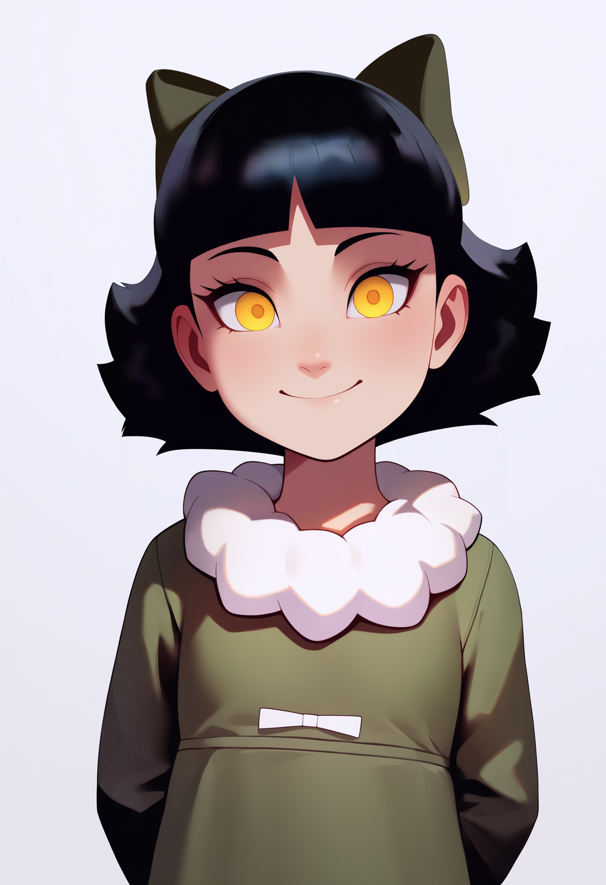 基本プロンプト:1girl, oliviamann, black hair, bangs, short hair, yellow eyes, hair bow