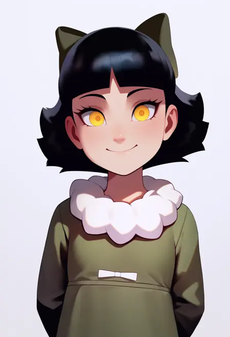 Basic prompts : 1girl, oliviamann, black hair, bangs, short hair, yellow eyes, hair bow