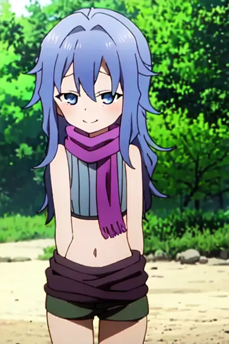 kunoichi_hagi, blue eyes, blue hair, long hair, crop top, sleeveless, purple scarf, shorts